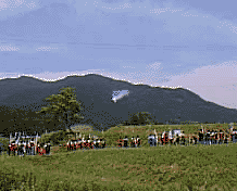 馬防柵付近に移って鉄砲隊武演を待ちます。すると子供武者総勢 100-200 人が連吾川に陣取りました。右、武田軍、左、織田徳川連合軍!しかし甲冑の家紋はお気に入りのを付けたためか、敵か見方かの区別が・・・ 槍隊、鉄砲隊、煙幕隊などいろいろセレモニーしてくれました。暑い中ご苦労様でした。それも休日なのに・・・四つの小学校+中学校が合同でこの祭りを盛り上げてくれていたようです。 |