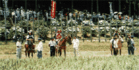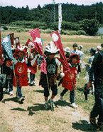 子供行列の中でも、彼ら三人は馬上の人!馬は地元の方の日本馬。サラブレットとは違い、足は太く、胴もしっかり。ちょっと小振りな馬です。 | |