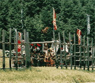 太鼓の演奏がありました。地元中学校+設楽原陣太鼓?の二つのグループ。 その後ろで出番を待つ鉄砲隊 16 人が左の写真です。旗指物がいろいろあって楽しいです。特に目を引いたのは、戸田半平の「ドクロの旗指物」、落合左平次の「鳥居強右衛門磔」、もう一つは誰のものか分かりませんが、「血を吐いている武者」の三つ。伊達家松根新八郎の「幽霊の旗指物」、長坂十左衛門の「天下無双」、前田慶次郎の「だいぶへん(武辺 or 不便) 者」と同じく、自己主張の現れがこの旗指物に良く現れています。 |