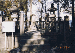 | 向こうに山県家の紋「桔梗」が見える!左にお墓と大弐像、右は舞台になっていた。 | 山県大弐先生のお墓。以前は隣のお寺にあった。先生の尊王論は民衆の平等という考え方よりきている。幕末の薩長とは少し異なる。 |