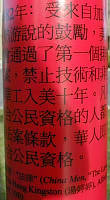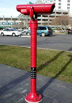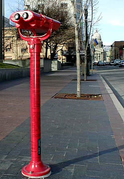 Capitol Boulevardの歩道上に立つ双眼鏡。州議事堂のほうを向いています。支柱に中国語・英語の説明文と漢詩が書かれています。