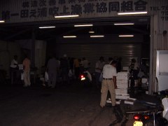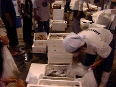 威勢のいい兄(あん)ちゃんたちの掛け声に、トロ箱の魚は見る見るうちに売れていきます。漁協の外には両手に一杯魚の袋を提げた人たちが家路を急ぎます。 |