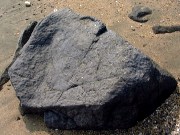 砂浜に降りると、ここもやはり黒い岩が点在する不思議な浜だった。浜に降りてみて気付いたことだが岩だけでなく砂の色も少し黒いのだ。 |
