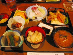 内容は・・・お刺身、たこと魚のから揚げ盛合せ、魚のあらが入ったみそ汁、季節の野菜の煮物、小鉢一品、漬物、デザート(果物)に、たこ飯がついてます。(写真は秋に撮影したもので、たこ飯の上にはマツタケが・・・)(^〜^)