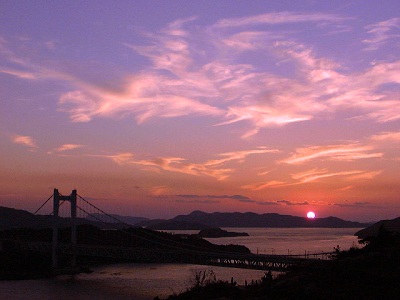 冬の夕陽が雲を染めていく。十年あまりの月日が経つと、自然の海岸線と人工の橋のコントラストも調和して見えるから不思議だ。