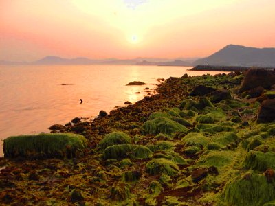 大潮の日の夕暮れ。春のぼんやりした夕陽に照らされて、岩をびっしりと覆った海藻が姿を現した。見る目には少し不気味に映るけれど・・・。