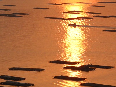 朝の光にキラキラと輝く海。カキ筏の隙間を縫って出漁する舟のエンジン音が静かな海に響き渡る。