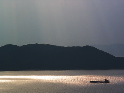 一瞬、曇り空から差し込んだ光のシャワーが海面を照らすと、沖行く船がシルエットになって浮かび上がる。