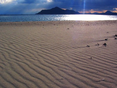 いつもは静かな瀬戸内海の砂浜も、時には冬の強風がこんなに美しい造形を作りだす。風が描いた模様はまるで砂丘のようだね...