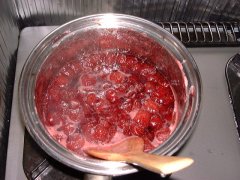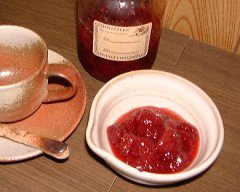 「少しゆるいなあ」と思うくらいでちょうどいいです。ジャムは冷やすとペクチン(炭水化物の一種)と糖分の作用でずいぶん固まりますから・・・。火から下ろしたら熱湯殺菌したガラス瓶などに移してそのまま冷ましてから冷蔵庫に保管します。 |