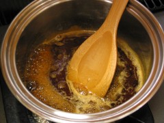 まず、鍋に煮汁の材料(しょうゆ、ざらめ、みりん、酒)を入れます。強火にかけ沸騰してきたら、しゃもじで鍋底のざらめをよく溶かします。 |