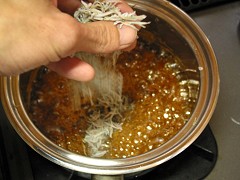 次にイカナゴの新子をひと掴み、かたまらないように回し入れ、しょうがの千切りを入れます。この要領で何回かに分けて、イカナゴを鍋に入れていきます。