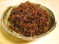 そして、写真のようにほとんど煮汁がなくなったらできあがり。手早く平たいバットかザルに、広げるようにして冷まします。(そのまま山盛りにするとくっつくので注意。) |