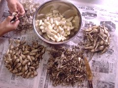 写真をご覧になるとよくわかると思いますが、右から時計回りに1人が茎柄とひげ根を落とす係。もう1人が薄皮を丁寧に剥く係。右左の配置も考えてすれば、1.5kgくらいはあっという間です! |