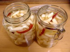 ここでのポイントは茎柄を切りすぎないことと、根の部分はひげ根を落とす程度にすること。そうしないと後で漬け酢がしみ込みすぎて柔らかくなっちゃいます。
