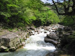 院庄から国道179号線を北上すること20分で奥津溪。この辺りまで来ると両側から山が迫り、吉井川も川幅が狭くなっています。ちょうど新緑が見頃だったのでしばし休憩タイム。