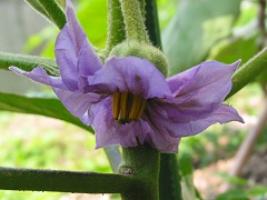 真っ白な花が咲くかと思いきや、薄紫の一番花がうつむき加減に咲いていました。はやく真っ白なナスを見てみたいなー。o(^-^
