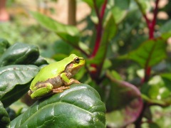その中でも目立つのがアマガエル。タアサイの葉の上で「早く雨が降らないかな〜」と雨乞いをしてるようです。 |