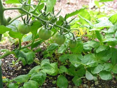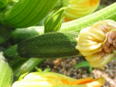 成長の早い緑のダイナーがようやく受粉したような気配。ズッキーニなどのカボチャ類は上手く受粉できないと、この後、雌花に付いた実もしぼんでしまいます。なので、早朝に雄花の花粉をつけてやるかハチなどの昆虫におまかせとなるんですが、なにせ植えているのが1本だけなので雄花と雌花が同時に咲かないとそのどちらも不可能。まぁ、何本かは収穫できるとは思うんですが・・・。(^^ゞ |