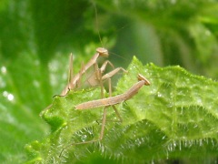 キュウリの先端近くの葉っぱの上では、孵化したカマキリの赤ちゃん。近寄ってみるとじゃれあうように遊んでました。