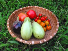 そこで慌てて今晩の夕食用に野菜を少し収穫。必要なときに必要なだけってのが家庭菜園のいいところですねぇ・・なーんて言ってみたいのだけれど、実はもうひとつのザルには35〜40cmほどの巨大なキュウリたちが山盛り・・・。