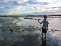 干上がり始めた高洲の浜に到着。長男も網を持ってやる気満々。ここには実にさまざまな海の生物がいるので、小さい子供でもじかに手に触れて観察ができる。さて、きょうはどんな珍しいものを見つけてくれるだろうか? |