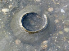 「誰だぁ〜!海にプラスチックのゴミを捨てたのは〜?」と思わず叫んでしまいそうだが、これも立派な海の生き物。といってもこれは、巻き貝の仲間ツメタガイの卵槐。ツメタガイはアサリの天敵で貝殻に穴をあけて食べてしまうところから別名「海のギャング」と呼ばれている。その姿は後ほどご紹介することにしよう。 |
