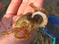 もうお分かりですね。答えはイイダコ。手の上にのせると小さな吸盤でくっついて(これがかなり強力!)逃げようとします。写真は端っこまで行ってつかまるところがなくて足を上げた瞬間。ちょっと間抜けな姿ですね。(笑) |