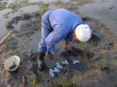 その方法は、絵の具用の筆を穴に入れシャコを刺激して、地面に上がってきたところを素手で捕まえるそうです。 |