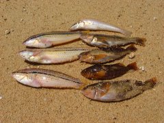 7月のある日、大浜の堤防にての釣果です。キス、アブラメ、ベラ(こちらではギザミといいます)など短時間でコンスタントに釣れました。