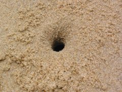 中から驚いたのか、砂と同じ模様をした小さなカニがスーッと姿を現しました。