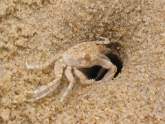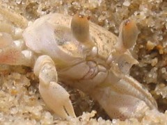 スナガニは、本来夜行性で、夜の間、波によって打ち上げられた生き物の死骸などを食べて暮らしています。