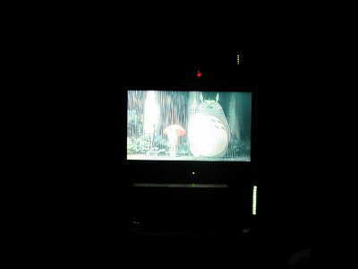 | おなじみの「トトロ」の名場面。上は小さく見えるが32インチのテレビの大きさ。下はプロジェクターで投射した80インチ弱の大きさになる。80インチではそのままではカメラの画面に入らなかったので調整してあるから、実寸とはちょっと違うかも。光る棒の違いはスクリーンの高さがテレビより若干高いせいである。それでも画面の大きさの違いは明らか。少し割り引いて考えても、これだけ違う。100インチはさらに大きい。映画はこのくらいのサイズから、「映画」になると思う。 |