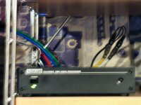 | この黒い箱は何だ? プロジェクターにも画像の調整機能がついているが、さらに別の機械で画像を細かく調整しようとする機械もある。これは低価格の画像調整機。さらにはラインダブラーといって、画像の走行線を機械処理で2倍に増やしてきめ細かい画像を作ろうとするものもある。パソコンでもそうだが画像は大きくなるにつれて荒くなる。これはデジタルの性質。フィルムはいくら拡大してもドットや走行線は見えないが、テレビやデジタル映像ではそうはいかない。ゆえに大画面ではこうした調整機が活躍する。 | サラウンドはいくつものスピーカーを使用すると書いた。最新のデジタルアンプには、それぞれのスピーカーから出る音を、一つひとつマイクで聞き取って、実際に人間のいる位置で聞こえる音によって、バランスを調整しようという機能がついてきた(現在はパイオニアだけ)。さまざまな住宅事情があるのでこの機能は今後どんどん採用されていくだろう。全ての調整を自動でしてくれるので全くの初心者でもすぐにバランスのとれた効果音を聞くことができる。これはそのマイクを設置したところ。このあと信号音を再生しながらものの15分ほどで調整が終了する。 |
