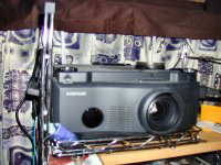 | これがプロジェクター。三菱製。背の高い棚を置いてその最上段にのっている。棚は排熱を考えてパイプ製の空気の通るもの使っている。プロジェクターを棚に入れる場合はランプの熱に注意。 また、写真をよく見ると逆さまなのがわかるだろうか。足が上にきている。プロジェクターの映像は底辺を基準に上に伸びていく特殊な放射をしている。下に置く場合、プロジェクターの下の位置が映像の底辺の位置にくるわけ。プロジェクターを中心に光が上下に広がると使いにくいから。プロジェクターを上にあげれば当然映像も上に上がる。 それで天上などの高い位置に設置できるプロジェクターは画像を上下左右逆転させる機能がついている。これでプロジェクターが逆さまでも映像は元の通りになる。このときはもちろん映像の上辺がプロジェクターにそろうわけである。 |