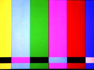 カラーバー デジカメの特性で色が少しずれてしまった。右の青の下にあるラインは本来白になる。左も黄色のバーの横にさらに白と青が逆転したバーがある。発色の具合を見て調整する。 |