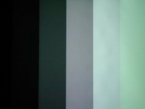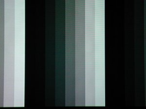 | 「白」と「黒」の調整は明るい部分と暗い部分の調整だけでなく、色の土台の調整でもあります。「グレースケール」をよく見ていくと、白と黒の調整をしながらも本来「白」と「黒」のはずが、赤みがかったり、青みがかったりしていることに気がつくと思います。これがもともとの再生装置の個性の反映になります。一般にテレビの画像は白が青みがかる傾向があります。プロジェクターでは映像を映すランプの特性で緑がかる傾向があります。「白」と「黒」を調整しながら、こちらの色味も直していくといいでしょう。ただ、一般には青みがかった映像はクールに、赤みがかった映像はホットな印象を与え、人の肌や雰囲気の再現に影響を与えやすいので注意します。色温度が低いフィルム系の白はやや赤みがかっているくらいが普通のようです。 ※もし、色調整で赤、青、緑の「オフセット」や「ゲイン」の調整ができるようなら、「オフセット」は黒色部分の色味を、「ゲイン」は白色部分の色味を調整するものと考えるとよいようです。グレースケールの各部分の色を見ながら、好みの色加減に仕上げます。映画用なら少し赤みの残る加減がよいかもしれません。また、「ガンマ」は一番明るい白と一番暗い黒をを維持したまま、中間部分の発色を助けますので、白飛び、黒つぶれがある場合は動かしてみます。 「カラーバー」のテストパターンは、本来は青のフィルーターを使って見ることで、色情報を落としておいて、両端にある青と白の輝度(発色の強さ)を整えるように「色の濃さ」を調整していくようです。うちには青のフィルーターがないので、そのまま見て色の輝きぐあいや濃さが過剰でないくらいに「色の濃さ」を落としています。 ここまでやったら今度は実際に映像を映して最終調整をしましょう。「グレースケール」では確認できても実際の映像では「ブライト(明るさ)」を下げすぎて黒つぶれが起こったり、「コントラスト」を上げすぎて白飛びが出やすくなっているかもしれません。実際の映像で確認して、ほどよいバランスであればよいわけです。 |