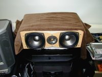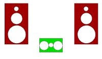 | 当初のセンタースピーカーの位置。実際には高さだけではなくて、センタースピーカーはさらに手前に来ていた。この位置だとはっきりとバランスが悪く、セリフだけが別な方向から聞えて気持ちが悪かった。この置き方ならセンタースピーカーはない方がよいくらい。 | やはり、理想はこうした配置にしたい。高さも距離も左右のスピーカーと合わせたいところ。ただし、こうした配置を実現できるのはシアター専用ルームがある人に限られるだろう。この位置でスクリーンも必要なら、音の通過性が良いサウンドスクリーンにする必要もある。我が家はなんとかこの位置をキープした。スクリーンはスピーカーより少し上の方に来ているが、音場の位置が自然なので、違和感はない。 |