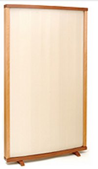 | こうしたことはオーディオを楽しんでいる方なら誰でも感じる点なのではないかと思います。そこで最近は少しでもこうした環境を改善していきたいということで、ルームチューニングということに興味を持っています。我が家ではこの一年少しずつ導入してきて、感想なども書いていますが、今回はそれをまとめて紹介していこうと思います。と言いましても所詮は素人で、どこかのコンサートホールのような素晴らしいチューニングなどができるはずもありません。目標はとりあえず「部屋の中からいらないものを出していくこと」「部屋から出せないものは視野の外に」「部屋の雰囲気はできるだけ柔らかいものに」ということにしました。とにかくもう少し、スッキリとしたシンプルな部屋を作りたいということです。 まず、我が家で一番最初に購入してみたのがクリプトンの「AP−5」という吸音材です。これは以前にも紹介しました。よりサイズの大きい「AP−10」というものもあるんですが、我が家は部屋ももともと8畳程度と狭いので小さいサイズにしました。構造はシンプルで、額縁のような縦長の木枠にミステイックホワイトの生地を二重に張り込んだだけのものです。簡易の足もついてきますので、自立しますからそのまま好きな位置に立てればセッティングも完了します。薄くて、軽いのも特徴で、なんにつけ苦労はありません。ミスティックホワイトというのは単品でも売っていますが、一見綿のように見えながら実は科学技術の先端を行くような特殊な布なのだそうで、グラスウールの4倍ほどの吸音効果があるそうです。とても、そのようなものには見えませんが、説明ではそうなっています。実際に使用してみるとスピーカーの周囲ならどこに置いても、再生音にあった雑味が消えていくのがわかります。消えていくのは部屋の残響であり、もともとのスピーカーから出た音ではない反響音というわけです。置き場所によっては吸音効果が目立ちすぎる場合もありますが、基本的には吸音を求めるよりも、部屋のノイズっぽさを取とって、すっきりさせる効果の方が本来の役割のように感じます。ですから、整音に近いかもしれません。スピーカーの外側の壁や後ろなどでも試しましたが、我が家ではリスナーの正面に設置するのがよいような気がしました。現在は2枚購入して、リスナーの正面と後ろに1枚ずつ設置してあります。 |