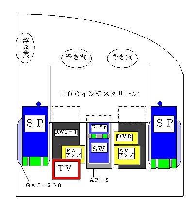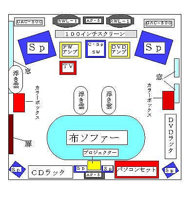 | こちらは我が家の配置を上から見た図。 それぞれの縮尺は正確ではなくだいたいの様子がわかるようにしてあるだけ。スクリーンの後ろにいくつも設置してあるが、RWL−1の厚みは10センチで、ちょうど良く収まった。GAC−500は15センチなので、スクリーンの後ろでは、スクリーンが膨らんでしまう。しかし、スピーカーの後ろでは全く見えない。 浮き雲も天井付近にあるから、実際には上を見上げないと見えない。ソファーは2人がけ用だが、中央が当然指定席だ。色分けで言うと、赤で示した「カラーボックス」「テレビ」「パソコンセット」がこの部屋でまず邪魔なもの。これでカラーボックスとパソコンセットの棚などは無事なくなった。 |