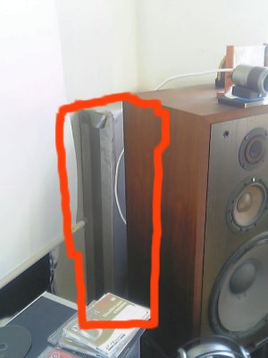 | 部屋をスッキリさせるには目障りなカラーボックスが2つありました。本棚として使っているのですが、これを外に出したいと思ったのです。この本棚も当初は部屋の響きが強すぎて、改善のためにわざわざ入れました。これを外に出すには変わりのものがいるだろうということで、ネットオークションで東京防音の「GAC−500」を落札してみました。設置場所はRWL−1が移動してあいたていたスピーカーの後ろ側です。本来なら部屋のコーナーで低音を吸収する「GAC−700」という製品を置きたかったのですが、オークションですから、思い通りのものというわけにもいきません。これもAP−5と似て、音をスッキリさせる効果があります。ただ、一番最後に設置したせいか、それほどビックリするような変化ではありませんでした。設置場所がスピーカーの裏ということで、中・高音の変化よりも、中・低音のすっきり感に効いていると感じます。これがないと全体にもっさりとした感じの音になり、特に低域の締まりがよくなったとは思いました。我が家のスピーカーは大きいので、「GAC−500」もすっかり隠れるくらいですから、よけいなものが目に入らないという当初の目的にもかないます。もちろん、カラーボックス2つ分の本は部屋から出すことができました。 |