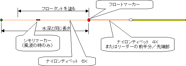 前半はリーダー釣りというかティペット釣りですから、キャスティングとしては、あまり遠投はできません。 ■アタリの取り方 (図は、シモリマーカーを使っていない状態) ![]() 補足:ちなみに、フライが軽いので、フロートマーカーも小さくて済みます。 しかし、フライが軽い分、ティペットのテンションが小さく、若干アタリが出にくい傾向もあります。 ・・・2つの釣り方の合わせ技なので、基本的には「リーダー釣り」と「マーカー釣り」のそれぞれの釣り方と同じです。 どちらかと言えば、「リーダー釣り」を基本としていますが、マーカーを使うと、ついマーカーだけを見てしまいますので、 結果的に、100%「マーカー釣り」になってしまうことも多いと思います。 しかしまあ、その辺は拘らず柔軟に考えた方が気楽だと思います。 |