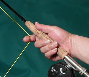 ◆キャスティングとフライ、フライラインの着水 シンキング、マーカーよりもドライ風に「出る」確率が高いので、キチンとターンオーバーさせて、ソフトにフライを着水させることが大事です。 ターンオーバー&ソフトな着水のためには、フォルスキャストでラインスピードをある程度上げて、シュートでは力を抜く感じがいいと思います。 シュートした後に、「こりゃ、うまくターンしないな」と思ったら、ラインハンドでラインをチョンと引くと、 ターンする回転力を補う(増加させる)ことができます。 フライラインを水面にたたきつけないように注意しましょう。 ◆スラックをとる ライン着水後、すぐにラインスラック(たるみ)をとります。この動作で(フライが動いて)釣れてしまうこともよくあります。 手早く、キャスト後のラインスラックをとるには、ロッドをスーと立てて、ラインを引き寄せてしまうのが便利です。 これでもバイトしてしまうことが多いです。 ◆ カウントとフォール(タナ取り) ラインを馴染ませる程度に、少しだけ待つ(カウント)。 ◆水面直下って、どのくらいの深さ? 私の感覚では、30cm以内という感じ かと思います。逆に言うと、この範囲くらいに収まるような速度でリトリーブします。 もちろん、狙ったポイントのリトリーブする範囲で という意味であり、手前まで引いてきた時には、30cm以上沈んでいるも多いです。 最初はフォーリングさせてタナを探ることも重要です。そのためにも最初は沈下するタイプ1を使うのがいいでしょう。 フォーリング中のアタリのとり方は、Positive Sinking のコンテンツを参照して下さい。 (できれば、このイマージングのコンテンツの前に、Positive Sinking のコンテンツをお読み下さい。) ◆フローティングラインでのイマージング(タイプ1=インターミディエイトとの違い) タイプ1は、もちろん時間とともに沈んでしまいます。 水面下数センチを狙いたい。長く待って釣りたい。ゆ〜〜っくりリトリーブして釣りたい という場合は、フローティングラインを使うことになります。 もちろん、フライも狙いのタナ(=水面直下)より深くフライが沈まないことが肝心になります。 ドライフライまたはフロートフライを「少しだけ沈ませて」使います。 フロートフライでは、「浮いている間はドライの釣りをして、沈んだらイマージングをする。」という柔軟な考え方もいいですね。 このセッティングの弱点としては、・・・ フローティングラインで、沈めるフライを使うと、ラインシステムが直線にならず、「くの字」(「への字」?)に曲がって、 伝達ロスがあるため、アタリが出にくい傾向になります。 ![]() 激シブでアタリが小さい時、魚がフライを瞬時に吐き出すような時は、ヒット率が悪くなります。 もちろん、タイプ1でも直線にはなりませんが、テンションのかかり方が違うので、はるかにアタリの感度はいいです。 ですから、フローティングラインを使用した場合は、特にテンションを維持することが肝心だと思います。 ◆タナが深い場合(フライ、ティペットの沈め方) どうも今日はタナが深いぞという場合、または 水面直下ではなかなか当たらないので、イマージングをやめてタイプ2に変更する前にちょっと沈めてみる という時は、 小さいガン玉(7号程度)、または粘土おもり。 シンキングリーダーでもいいですが、タナの変更にリーダーの交換が必要になります。 ◆リトリーブ 同じ引っ張り系の釣り方でも、もうストリーマー系を追わないような魚に対する戦術ですから、 リトリーブは基本的には「ゆっくりと」。ただし、状況によっては例外もあります。 大きいフライは少し速いリトリーブ、小さいフライはスローなリトリーブがいい という傾向があります。 いずれにしろ、 ストロークは短め(10cm程度)が基本。ソフトハックルパターンではアクションさせるために、 シンキングの長〜いリトリーブはあまり使わないです。 「シェイク」 ロッドを小刻みに振って、フライを躍らせるようにリトリーブさせる釣り方もあります。 ◆「トリガーリトリーブ(引き金リトリーブ)」 Trigger Retrieve イマージングの研究実釣の模索の中で、気づいたリトリーブを紹介します。 気づいたと言っても、前からやってはいたので、「イマージングに適しているな」と気づいたという意味です。 でも、もしかしたら、このリトリーブ方法はだれもが知ってる「常識」的な方法なのかも知れません。 私はあまり釣りの雑誌や本を読んでいないので知識不足であり、ひょっとしたら、すご〜く恥ずかしいコンテンツを 書いている可能性もあります。 (こんなHPを作っていて、イマサラ ですが^^;) しかし、自分としては、本当に「気づいた」のですから、しかたありません。 「トリガーリトリーブ(引き金リトリーブ)」と名づけました。 trigger: 引き金。 retrieve: 取り戻すこと。本来「引く」という意味はないが、フライフィッシングでは、キャストしたラインを引き戻すこと