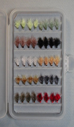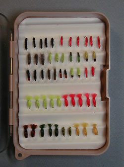 ■FLY BOX-3 マーカー釣り用フライ 私がここで言っている「マーカー釣り用フライ」という意味は、 マーカー釣り(ルースニング)の時に、基本的には「ほったらかし」状態で、 待ちの釣りをする場合に使う、あまりアクションしないフライのことです。 逆に、アクションするフライというのは、マラブーやBWPなどの柔らかい マテリアルを使用した、水中でフライを動かすと、プロポーションに 動きのある、芸をするフライのことです。 まあ、早い話が、ここにあるのは、タコフライまたはエッグフライ、 ビーズフライ、モヘアフライ・・・などです。 原則として、全てウェイテッド(レッドワイヤー巻き)です。 |