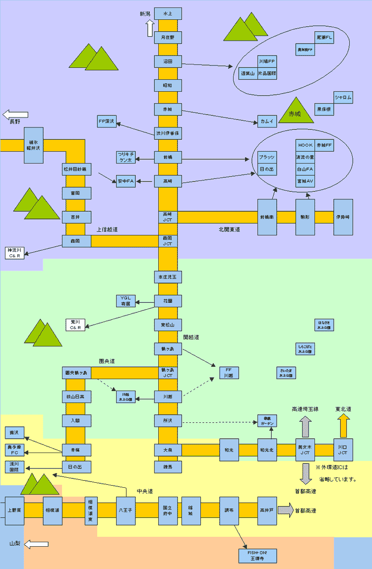 【コンテンツ説明】 釣具屋さんに貼ってあった地図をヒントに作ってみました。(^.^) なんとなく、上が北になるような感じで作りましたが、方角も距離もまったく合っていません。 単純に、どのIC(インターチェンジ)から釣り場へアクセスできるかを簡易図化したものです。 (ルートは自分の好みの部分もあります。) 自分(自宅)中心の内容でスミマセン。個人HPなので(笑) オリジナルの図が大きすぎたのでサイズ調節したら、ピンボケになってしまいました。 う〜ん、なんか中途半端なコンテンツですね。クリッカブルマップ連動なら少しは役に立つかもしれませんが。 ■もう少し正確な地図 ![]() ご休憩・お食事はこちら → PA・SAガイド (下段の県名をクリックすると詳細が表示されます) ------------------------------------------------------------------ ■オマケ 関東近郊高速道路 絶好の記念撮影ポイント(写真代は高いですよ〜) [表中の数値は、始点からのkmポスト表示位置] ![]() ※全て自分で確認しているわけではありませんので、間違っている可能性もあります。 また、この表を使用した場合のいかなる結果に対しても責任は負えませんので、予めご承知下さい。 最近のカーナビはこうゆうデータも登録されているみたいですが、私のカーナビは古いので当然ありません。 |
