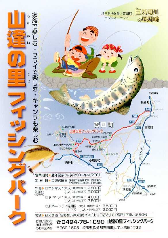| 釣り場 | 山逢の里フィッシングパーク 埼玉県秩父郡吉田町大字上吉田1733(関越道花園ICから33km) TEL: 0494-78-1090 |