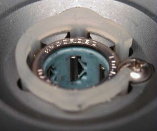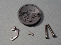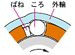 ★ついでに、スプールに入っているローラークラッチもマクロ撮影してみました。 ![]() ●ローラークラッチとは・・・ 基本的にはベアリングの一種、「ローラーベアリング」(ころ軸受)ですが、ちょっと細工がしてあり、 片方向にしか回転しない「一方向クラッチ」(ワンウェイクラッチ)になっています。 下の図は、その原理を分かりやすくするために、軸(円)ではなく板(直線)で説明したものです。 説明といっても、図の通りで簡単な構造です。(またこんな図書いたんか!) ローラーが収納されているケーシング(青い部分)の底がテーパーになっているのがポイントです。 【上( FREE ) の図】 ローラーは、通常、バネ(緑の部分)で押されていて(引っ張りバネ型もあり)、一番広い空間(左の空間)にあります。 ここでは自由に回転できます。 また、軸(板)が挿入されても図の左方向(矢印)への移動(回転)ならば、その場で滑りながら回転できます (この場合なら、時計回り)。 ![]() 【下 ( LOCK ) の図】 上と反対に、板が図の右方向への移動では、ローラーは板によって回されて(反時計回り)、その回転により、 テーパー部の狭い空間に進みます。 その結果、ローラーはケーシングと板に挟まれて、回転できずにロックしてしまいます。(くさびの原理です) (実際には板ではなく軸ですので、このユニットが円周状に配置されていると、軸(板)の逃げ場がなく、 すぐにロックしてしまいます。) つまり、この例ならば、(ローラーは)「時計回りはできるが、半時計回りはできない。」(軸は逆になります) 片方向にしか回転しない「一方クラッチ」になります。これが「ローラークラッチ」のメカニズムです。 説明図の板を軸に置き換えると、こんな感じになります。→ (あら、バネはどっち側だっけな)・・・って、なんで、こんなこと説明してるんでしょ(笑) |