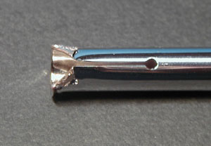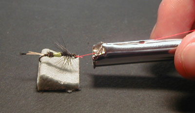 フライ雑誌に「リリース・パイプ」というリリースのツールが紹介されていて、なるほど!と感心し、私も製作してみました。 ホンプ式のシャンプーやリンスのパイプを材料にするものです。 ![]() このパイプを作った後のある日、近くのスーパーの中にある「88円ショップ」の文房具コーナーで、昔懐かしい物を見て、 「!!」とヒラメキました。 ■鉛筆用キャップ(3ケ入り88円) ・・・「クロームサヤ」って、強引な名前ですね(笑) ![]() 初めからスリットが入っているのがミソですね。 ■スリットをペンチで折り曲げてしまいます。(ヤスリでバリのないようにします。) ![]() ■使い方 ①魚の口にフッキングしているフライ と思って下さい。 (見やすいようにティペットを赤い糸にしました。/ピンボケですみません) ![]() ②ティペットをキャップのスリットに入れます。 (折り曲げていなくてもティペットは入りますが、曲げた方がスッと入ります。) ![]() 特別出演:手タレ(CMなどの手だけのタレントのこと)=娘です。(^.^) 「お父さん、これ何やってんの?」 「いいから、いいから。もうちょっと赤い糸を引いて。そうそう、そのまま。」 ③移動させて、フライをキャップの中まで入れます。そして、押すと・・・ ![]() ④フライが取れて、魚はノータッチでリリースできます。 ![]() ----------------------------------------------------------------- ■鉛筆シリーズ第2弾 ![]() ■こいつの先端はこんな感じです。 ![]() ■2003年 12月 7日 追加 現在、使っているのはこれです。 ![]() 100円程度のシャープペンシル(ラバータイプ軸)を分解、加工したもの。 クリップ付きなので便利です。 |