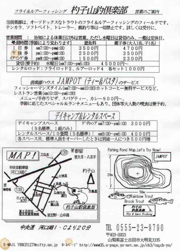 | 場所 | 杓子山釣倶楽部 (山梨県富士吉田市大明見3335) TEL: 0555-23-9790 当日貸切 |