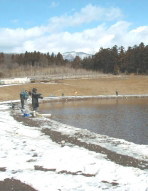 | 釣行報告 | 2001年 2回目の釣りは、3週連続の雪に阻まれ、1ケ月振りとなりました。 そして、ようやく、白山FAに初釣行することができました。 (白山FAのパンフは管理釣り場情報No.19を、オープン日の様子は12/23HOOK釣行記を参照して下さい。) 前日の天気予報では、風が強いとのこと。しかし、もう贅沢は言っていられないなと思い、赤城おろしを覚悟の上で、釣行を決定。 気合充分と言いたいところですが、朝起きれず、AM8:00自宅出発。(軟弱!) 関越道を北上。高崎ICの手前では、来月末に開通予定の北関東自動車道の工事が進んでいる。標識などもできていて、白いカバーがかかっていた。 なお、高崎方面からならば、電力中央研究所前からではなく、群馬フラワーパーク北口ゲート側の道路から入った方が近いです。(ふれあいの郷に入る信号を右折) AM9:15 白山FAに到着。なんと、駐車場には20台くらいしか車が止まっていません。ガラガラです。若干不安になりながら、受付で1日券\4000を購入。なお、受付ハウスとトイレの間に、プレハブの休憩所ができていました。(中では、ストーブが20度の設定で、ガンガン燃えていました。) タックルを持ってフライ専用池へ。駐車場の車の量からして当然ながら釣り場もガラガラ、17、8人。 う〜ん、オープンの時、釣れなくてみんな怒っていたみたいなので、敬遠されているってことかな?と思いました。しかし、ネットのお仲間の「みっちょん」さんや「aokiyo」さんはオープンからしばらくしての釣行で爆釣だったみたいなので、私もなんとかがんばろうと思いました。 池の手前林側、共用池のアウトレットの少し左に場所を選びました。(山から風が吹いたら、左からの風になるような位置にという選択です。) 先行の人を見ると、ほぼ全員ルースニングをしています。まあとりあえず、活性をみようとシンキングのタイプⅢをセット。フライはパッチについていたオリーブを横着してそのまま使う。釣り開始。風はまだ強くないです。 ・・・3投目くらいに初めての当たりがありましたが、フッキングしません。2投して、また当たり。乗りません。5投に2回くらいのペースで反応があります。活性はまあまあと感じましたが、フッキングしません。しばらくして、ようやくフッキングしましたが、足元でバラシ。 食いが浅いのか? 初めての釣り場では、最初のタナやポイントなどを手探りで見つけなければならないので、なかなか調子が上がりません。 どうやら、魚は深めにいるみたいで、上の層より下の層の方が当たりは多いです。他の人のルースニングのマーカー下もかなり長めです。それから、事前情報では岸から5mほどのところにあるカケアガリ近くに魚が寄っているとのことだったので、その辺りを注意しながらポイントも探りました。 かなり頻繁に当たりはあるのですが、なかなか乗らず、最初の1尾を上げた時は、30分以上経ってからでした。 クイーントラウト。この魚は初めてなので記念撮影。 ![]() 体のサイズに較べて、口が小さい。どうも、フッキング率が低いのはこれが原因のように思います。 池はかなり濁っていて、どうも、暗いカラーのフライがよくないみたいなので、(当たり前だ!)色を白にチャンジ。 これがよかったみたいで、当たりが増えて、だんだん釣れ出しました。平均35cmくらいのクイーントラウト。しばらくして、45cmも釣れました。 タイプⅢでは早すぎるのか、カケアガリ付近の形状のためか、ときどき根掛りもします。ここの池で使っている石はザラザラの石が多く、それもフライが引っ掛かるのを増やしている気もします。 15分に1尾のペース。当たりはその3倍くらい。しかし、時折強い風が吹くようになり、シンキングとは言えキャストし難いコンディションになりました。 風のためか、私の右、共用池へのアウトレット付近にいた人が移動したため、私の右側に池全周の1/5くらいの空きができました。 「こりゃ、カケアガリをトレースするのにはちょうどいいな」と思い、その辺りを集中的に攻めてみました。(下の写真) ←(だれも写っていない!)やはり、カケアガリでの反応はかなりあり、魚が濃いようです。もう少し沈下の遅いラインを使わなければ、だめのようですが、めんどくさいので、タイプⅢのまま、釣り続けてしまいました。(こうゆう手抜きはイカン!と、いつも後から反省する点なのですが) ルースニングでかなり釣り上げていた人がやって来て、「よく当たりますね。フライはなんですか?」と声を掛けてくれました。 私が「さっきは白、今はクリームのマラブーです。」と答え、いろいろ話をして、たくさん情報を教えていただきました。 整理すると、 1.オープンの日も来たが、あまりに釣れないので早めに帰る人が多かった。みんな文句たらたらだった 2.この辺りは釣り場が多いので、皆、宮城AVやHOOKなどに行っているのだろう。 3.カケアガリは2段になっていて、その先は4.5mフラットである。 4.ルースニングのタナも3m、4mで